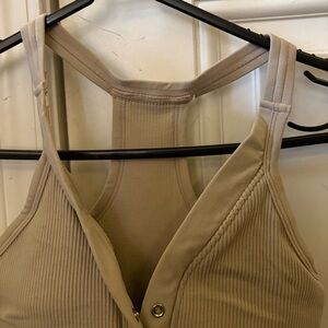 Stylish tan ribbed tank top with button details. Perfect for casual wear.