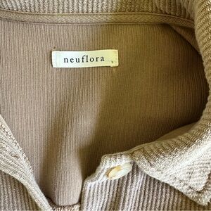 Tan, ribbed women’s button up/shacket. Fairly light weight. Two functional pockets and functional buttons.