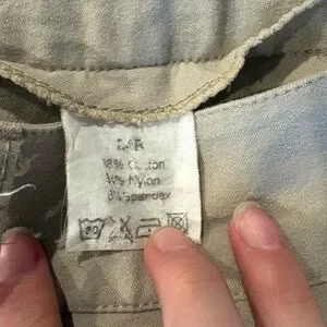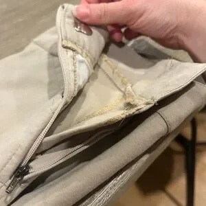 Has some dark spots and one section of the knee patch with missing stitches. Not ideal for shows but perfect for schooling.