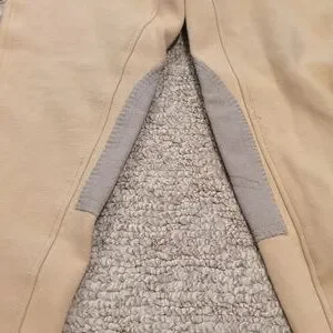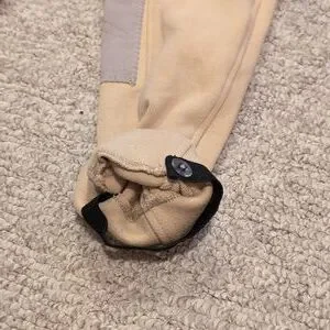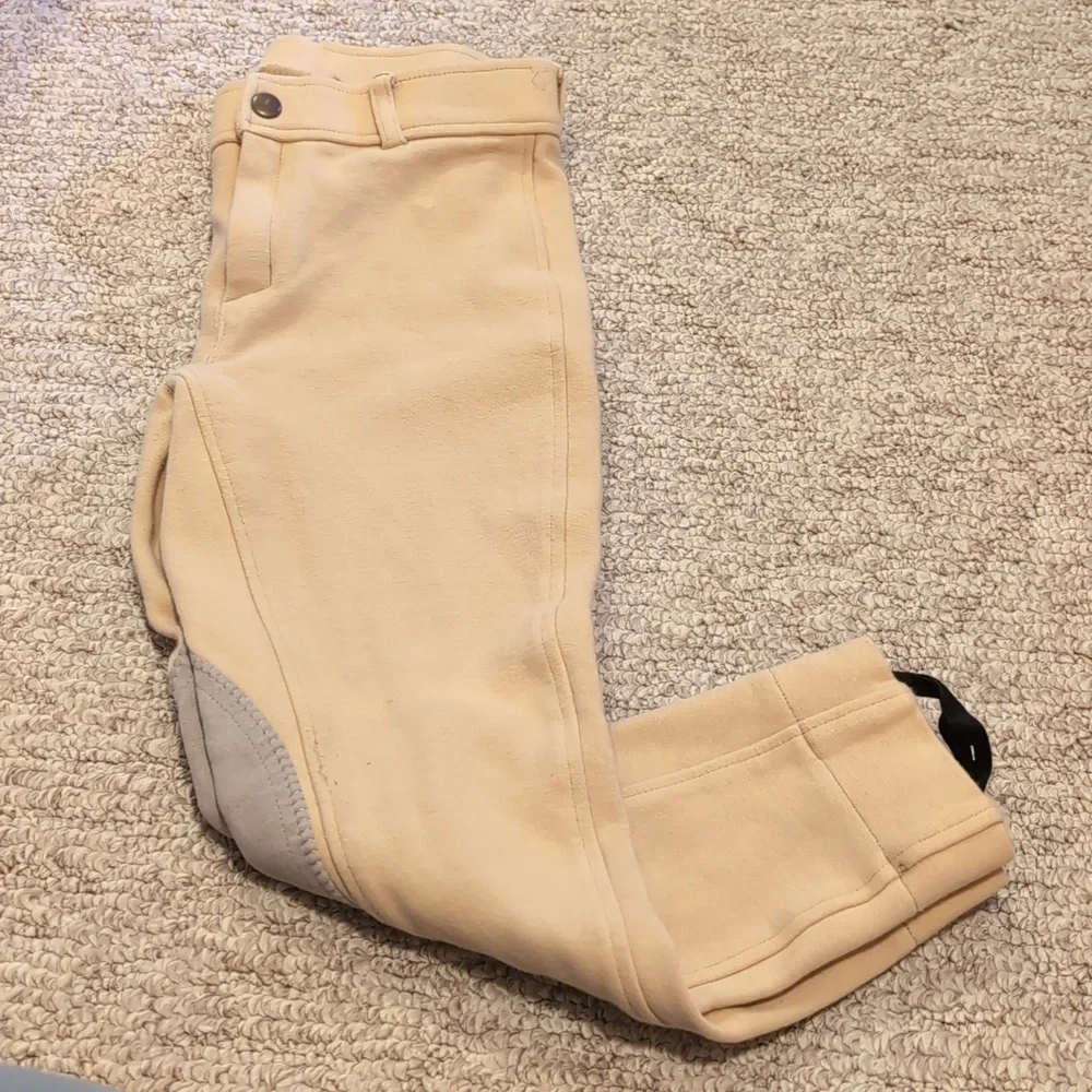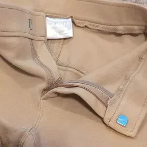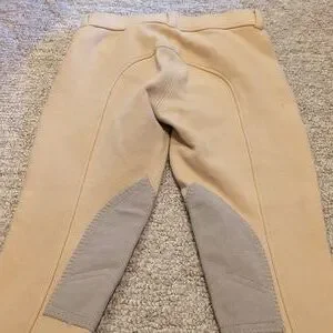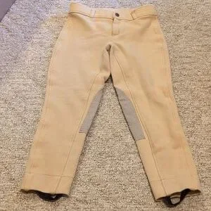Stylish tan riding pants featuring gray knee patches. Perfect for equestrian activities. Tag says 12 but they definitely run a little smaller.bMorw of a medium 8/10 I would say. Gently used with a few loose strings here or there, doesn't impact wear.