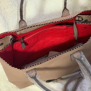 Fun and simple tan vegan faux leather shoulder bag. Cute stitching details on top of bag. Comes with option to have short or long strap. Never used, new with tags on - tan vegan faux leather Rimen & Co. purse with solid red cotton lining.