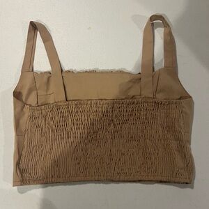 Stylish tan ruched crop top with adjustable straps. Perfect for casual outings.