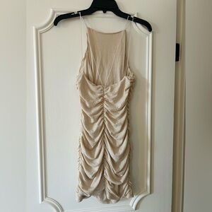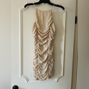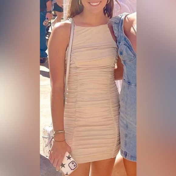 Tan Ruched Dress - very comfortable, stretchy, and flattering! Would be perfect for gameday, or just a night out!