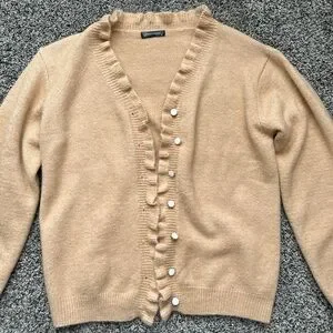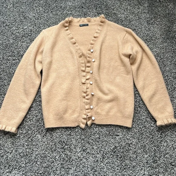 Stay cozy and stylish with this tan ruffle button-up sweater. Perfect for layering and adding a touch of elegance to your outfit.