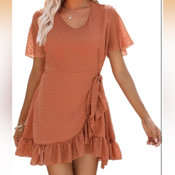 Elevate your style with this charming tan wrap dress. Perfect for any occasion, this dress features a flattering V-neck and delicate ruffle details. A must-have addition to your wardrobe. Never worn only washed.