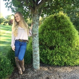 Tan ruffled shirt with v cut front features a cold shoulder look // super comfy and soft! PERFECT for a fall day! Absolutely stunning!