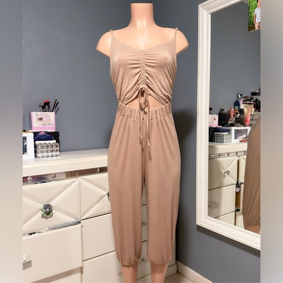 Discover elegance with this tan sleeveless jumpsuit, perfect for versatile styling. Enjoy the blend of comfort and fashion in every wear.