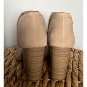 Tan Soda Brand Chunky Heels! These heels are in excellent condition with no major damage, just normal light wear; zippers are in good working condition. Size 7.5 and coming from a non-smoking and pet-free home.