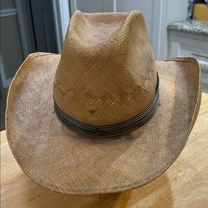 Stylish tan straw cowboy hat. Perfect for outdoor adventures. See photos for details. Hat has a rustic worn look by design. Bundle with other items for discounts.