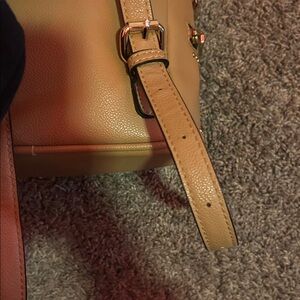 Stylish tan backpack with studded design. Straps are adjustable. With two small inner pockets