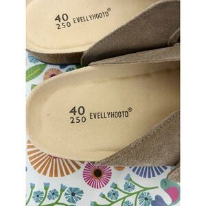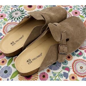 Stylish tan suede clogs with adjustable strap. Perfect for casual wear.