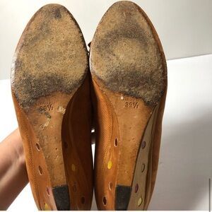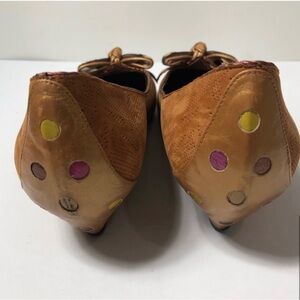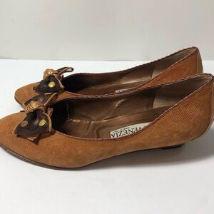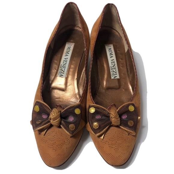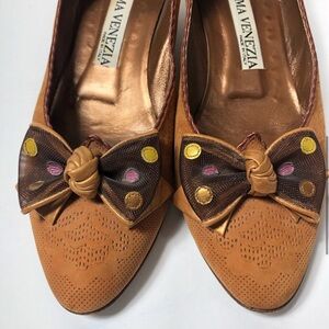 These elegant flats feature a warm tan suede-like material with a charming bow adorned with metallic accents, offering a sophisticated two-tone effect. The slip-on design ensures comfort and ease, while the light beige inner lining adds a touch of contrast. Perfect for adding a stylish flair to any outfit.