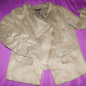 Tan Suede Jacket with asymmetrical gold zipper and stylish flap closure with cinched waist.