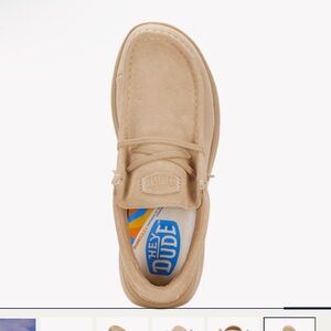 WOMEN’s Hey Dudes-These tan loafers feature a soft suede-like material and a moccasin-inspired design with visible stitching around the toe. The slip-on style ensures easy wear, while the durable rubber sole provides comfort and a slight lift.