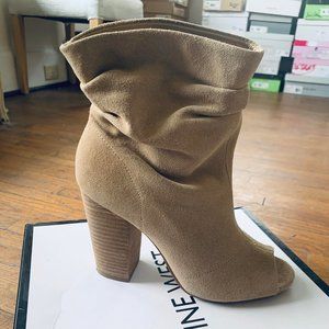 Tan suede open toe ankle bootie.Size 7.5M. Only worn one time. In excellent condition Stored in box with original stuffing. Brand Nine West.