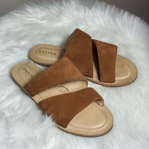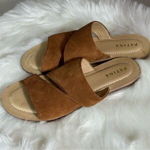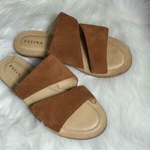 These tan sandals feature a minimalist design with two wide, asymmetrical suede-like straps for a modern look. The slip-on style ensures easy wear, while the light beige sole adds a subtle contrast. Perfect for casual outings, these sandals offer both style and comfort.