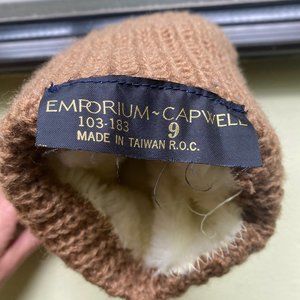 These boots are real suede with a faux fur lining and a knitted cuff. The cuff can be worn up or down as seen in the photos. The heal is wrapped brown leather and about 3 inches high. They are very comfortable, especially when worn with skinny jeans or leggings.