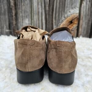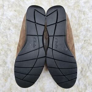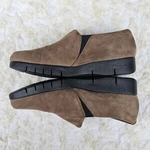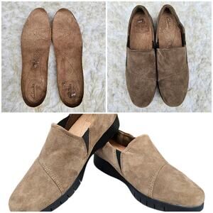 Tan sueded leather upper w/ flattering seam details. Slip on style shoes w/ elastic stretch gores, removable cushioned insole, flexible outsole, round toe. Issues noted in photos. Very good preowned condition, overall. Size 6 M by Clark's Artisan. Style: Daelyn Monarch.