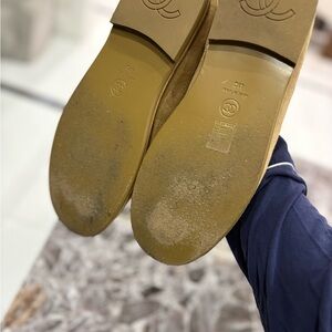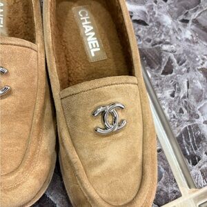 Elegant CHANEL loafers crafted in soft tan suede. Features the iconic logo for a touch of luxury. Perfect for elevating any outfit.