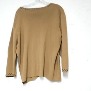 Stay cozy and stylish with this tan sweater featuring a charming polka dot trim. Perfect for any casual outing.