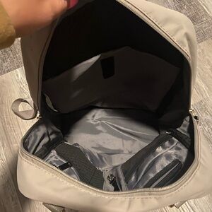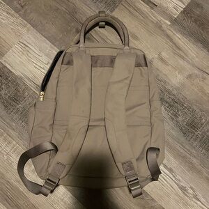 Target backpack. Tan color. There are a few spots on it but it’s a nylon material and should be able to be cleaned. It’s a good size for a backpack and is comfortable on the back!