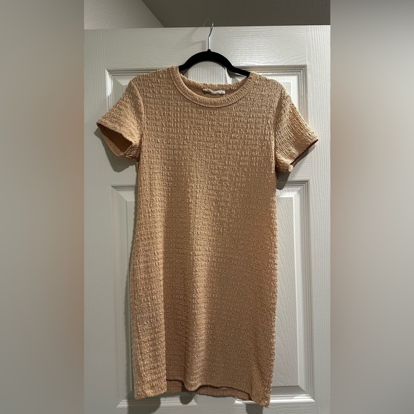 Step out in style with this tan / peach textured dress. Perfect for any occasion, this dress offers a sophisticated look with its unique texture. A must-have addition to your wardrobe.used as a beach cover. Great for summer