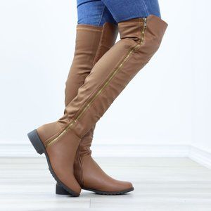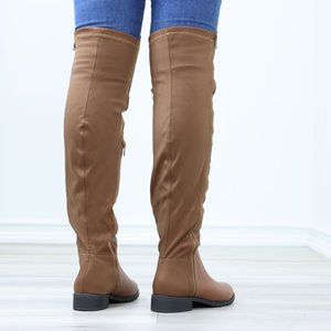 Tan Thigh High Over The Knee Faux Leather & Stretchy Material Low Heel Boot