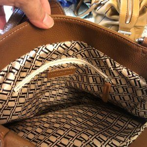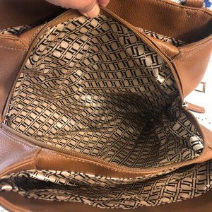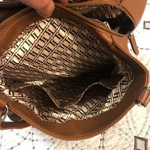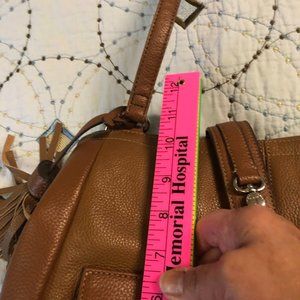 Women's tan Tignanello leather purse, 3 divided sections, middle section is zippered, other two sections have pockets for storage and there are two small snap closures pockets on the outside, it closes with a snap closure and has a decorative tassel. Silvertone hardware. In very very good condition. Dimensions are shown in pictures.