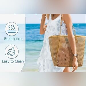 This stylish tan tote bag is perfect for casual use. Durable Polyester Large Capacity Mesh Beach, Shopping Tote Bag