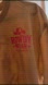 Comfortable tan t-shirt featuring a bold pink logo.