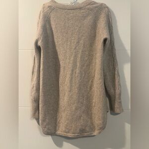 This tan V-neck sweater features a soft knit material and a relaxed fit, making it a versatile addition to any wardrobe. Its fine knit texture and slightly longer hemline offer a classic and comfortable style. Perfect for pairing with various outfits, this sweater is a must-have for any casual occasion.