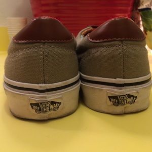Brown strings, brown leather tongue and back, rainbow striped inside-worn just a few times, have a few smudges on the white soles, other than that they are in perfect condition, no stains on the tan fabric