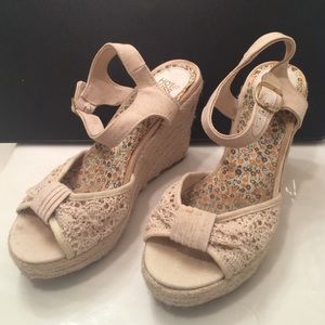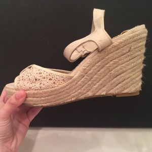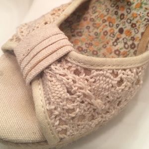 These are tan fabric wedge sandals, perfect for warmer weather. The wedge has a twine weave all the way around while the front fabric has beautiful lace detailing. 🚫NO TRADES🚫
