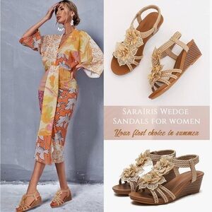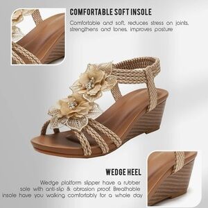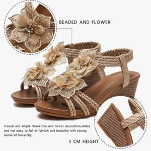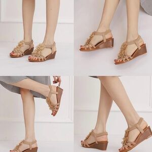 These tan wedge sandals feature a stylish open-toe design with a natural wood-like heel. The braided straps and large fabric flowers add a touch of elegance, making them perfect for any occasion. Size 8!