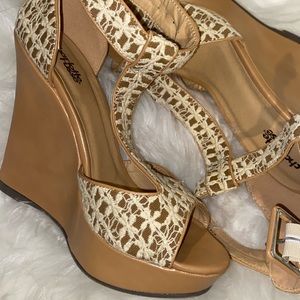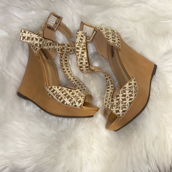 Size 7, brand new tan wedges with white lace details. 👡