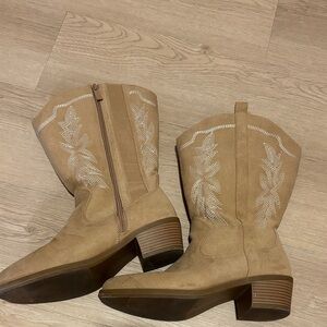 Step out in style with these chic tan western-style boots. Perfect for any occasion, these boots offer both comfort and elegance.