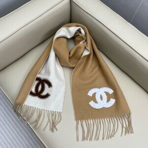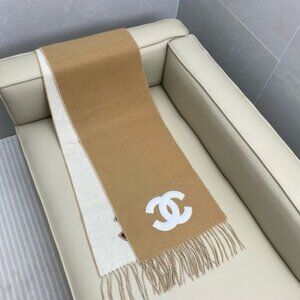 This tan and white Chanel scarf features a distinctive brown CC motif on one side and a white CC motif on the other. It’s reversible design offers a unique contrast, perfect for adding a touch of designer sophistication to your ensemble.