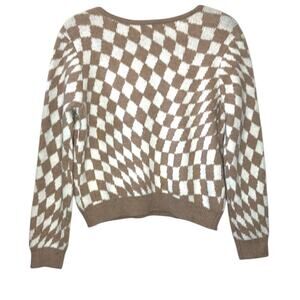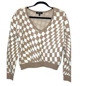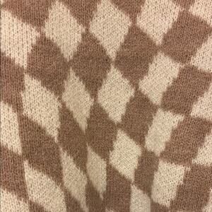 Stay cozy and stylish with this tan and white checkered sweater. Perfect for any casual outing. This sweater is made from a blend of acrylic, nylon and polyester, offering a soft and comfortable fit. The classic checkered pattern adds a touch of sophistication, making it a versatile addition to your wardrobe.