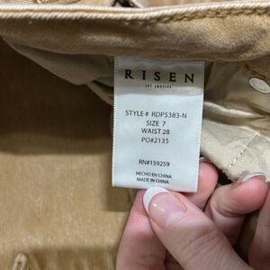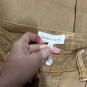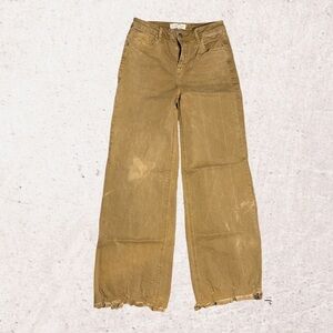 These tan jeans feature a wide-leg flare design, offering a relaxed fit that flows effortlessly from hip to ankle. The frayed hem adds a touch of casual chic, making them perfect for everyday wear. Crafted from sturdy fabric, they promise both comfort and durability.