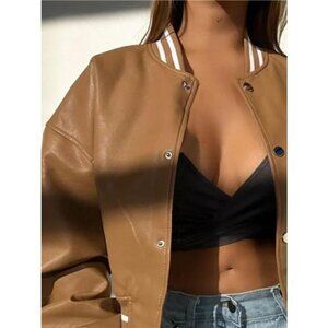 Elevate your style with this chic tan bomber jacket. Perfect for any occasion, this jacket offers both comfort and fashion-forward design.