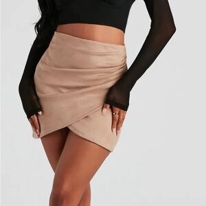 Step out in style with this tan mini skirt from Windsor, designed with a chic wrap and ruched detailing. Perfect for cocktail occasions, its form-fitting silhouette and elegant texture add a touch of sophistication to your evening ensemble.