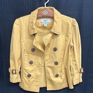 This Tan Yellow Fall Jacket from American Rag combines classic styling with modern flair. Featuring double button front, peplum style waistband and belted cuffs, it offers a chic and versatile addition to any wardrobe.