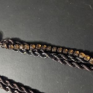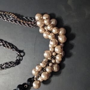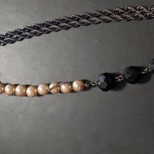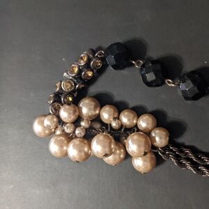 Tan and Black Faux Pearl Rhinestone Chain Long Statement Necklace. 32" long.