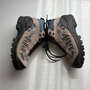 These hiking shoes feature a stylish tan and black color scheme, perfect for both performance and style. The high-top design offers excellent ankle support, while the reinforced toe cap ensures durability. With a black rubber sole for superior traction, these shoes are ideal for any active pursuit.