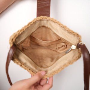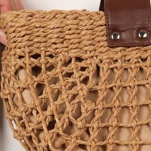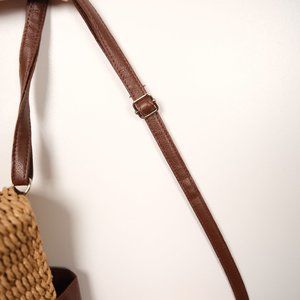 Stylish woven crossbody bag. Features a tan netted design. Brown leather flap and strap. Perfect for casual outings.