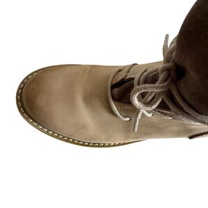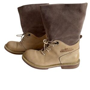 These mid-calf boots showcase a striking two-tone design with a leather lower section and a suede upper. Featuring lace-up closure. They offer both style and functionality. The robust sole ensures comfort and durability for everyday wear. Custom made. Would be great for Cosplay or costume. Not sure of size. See measurements in photos. Light color leather with suede leather upper. Satin lining. Very sturdy construction. Marked Size 235mm which converts to US Women’s Size 7.
