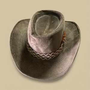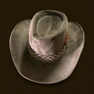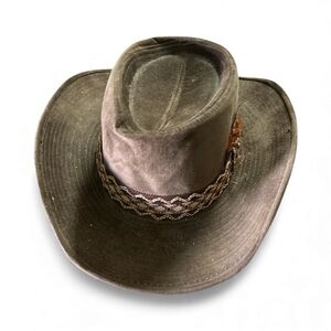 Tan and Brown Western Cowboy Hat W/ 70’s Decorative Distressed Band. Suede Finish. Made of cotton & rayon. Sz Large 7 1/4 - 7 2/3.