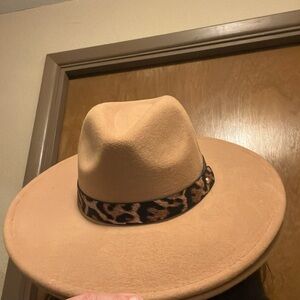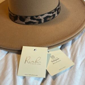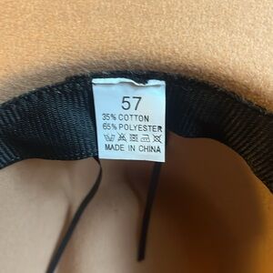 This stylish tan and brown wide-brim hat is a perfect accessory for any occasion. Its classic design features a wide, flat brim and a decorative band that adds a touch of elegance. Crafted from a soft, sturdy poly cotton felt, this hat combines comfort with timeless style. Adjustable inner band to fit a range of sizes. New boutique overstock.