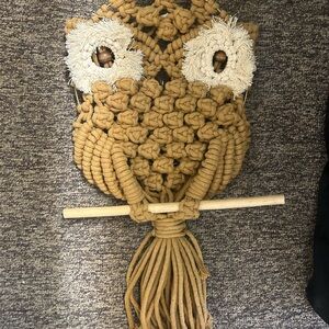 This exquisite fiber art piece showcases a beautifully crafted owl using tan and cream cords. The intricate knotwork forms a feather-like pattern, adding depth and texture to the design. Perfect for art enthusiasts, this wall hanging brings a touch of nature-inspired elegance to any space.