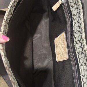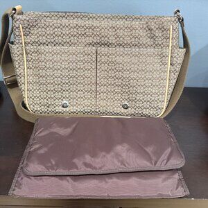 Coach diaper bag but didn't use it as a diaper bag but a tote. There is 2 pockets and a changing pad that has never been used. There is a few water stains on the tan strip on the front